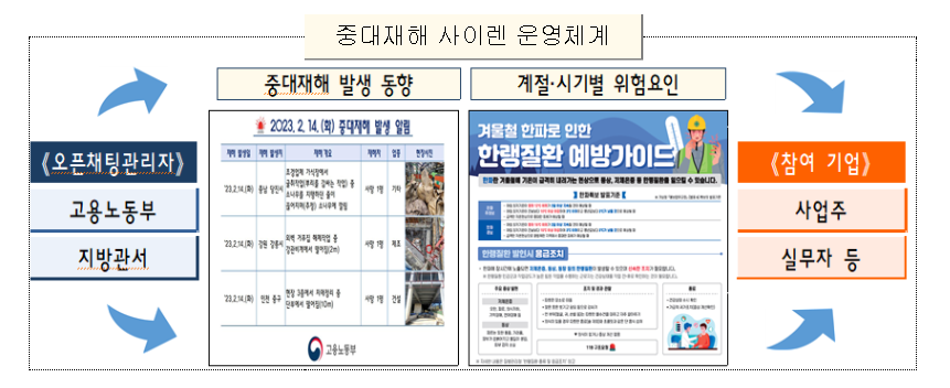 2022년 11월 30일 발표된「중대재해 감축 로드맵」의 후속조치로 추진되는 ‘중대재해 사이렌’은 사고 발생 동향을 즉시 알려 현장의 경각심을 높이고 유사재해 재발을 방지하는 것을 목적으로 하며, 오픈채팅방을 활용하여 기업 관계자에게 전국의 중대재해 발생 사실을 신속하게 알리고 다발.유사 재해 분석, 계절.시기별 위험요인, 위험성평가 등 현장의 예방준칙, 안전.예방조치 우수사례 등의 정보를 수시로 공유한다.