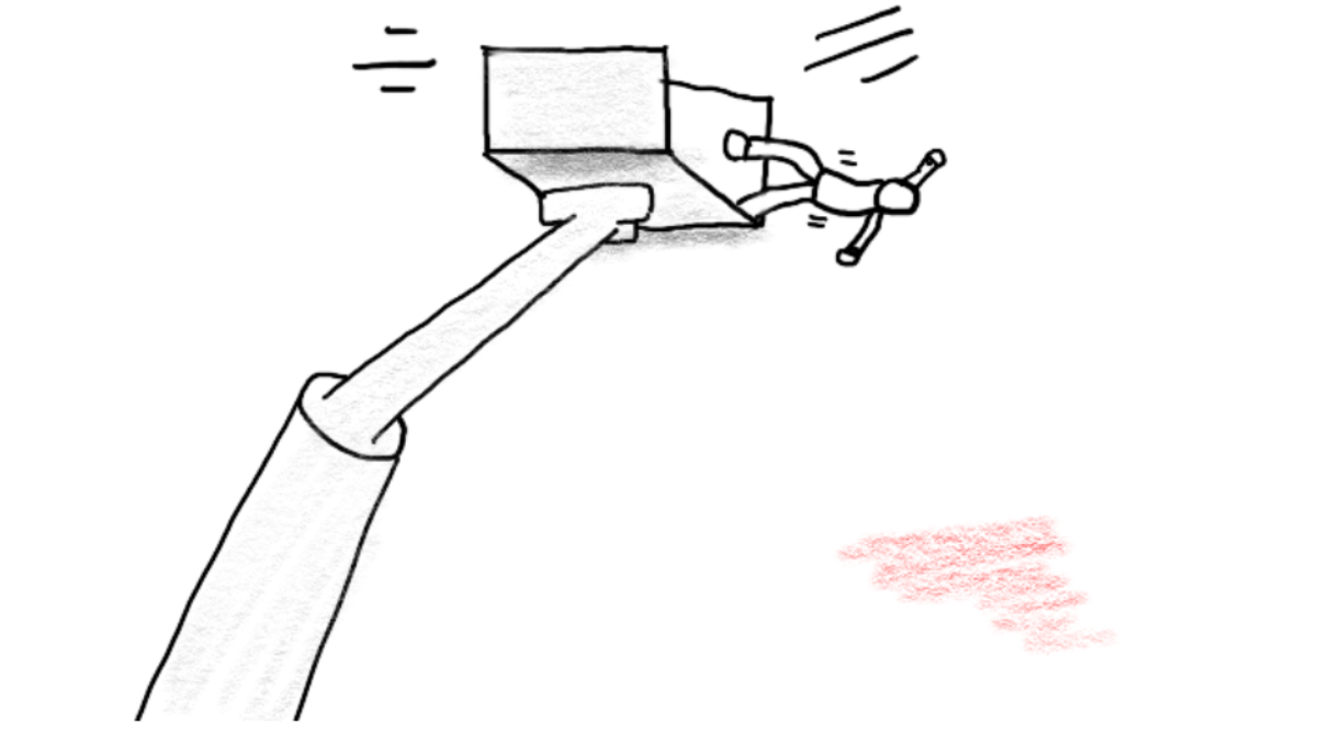 재해자가 천장크레인으로 대형 콘크리트 블록을 운반하여