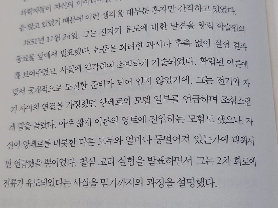 페러데이와 맥스웰의 연구는 21세기 물리학의 가장 위대한 초석이 되었으며, 과학적 진리를 찾는 영감의 원천을 제공하고 있다. 더불어 이 책을 통해, 어떤 삶이 좋은 과학적 삶인지를 엿볼 수 있었다.