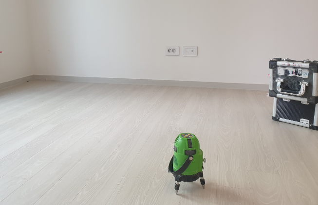 거실 바닥에 덩그러니 놓인 레이저 레벨기, 아파트 사전점검에서 수평수직을 담당할 놈이다.