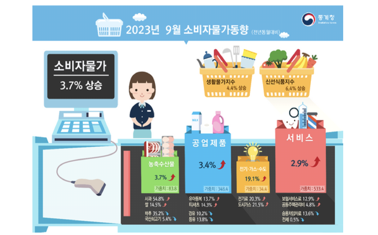 KOSIS 국가통계포털 자료에 따르면, 소비자 물가지수(9월)는 112.99로 전달 112.33보다 상승했다.