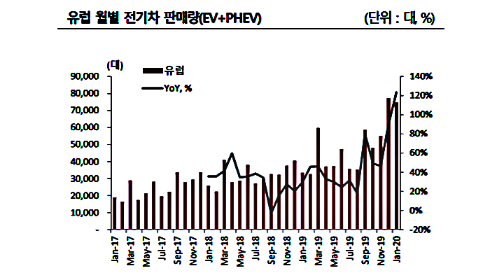 1월 유럽 전기차 판매량은 52,000대로 전년 대비 강한 성장세를 보여줍니다. 19년도 전 세계 판매량 176만 대 중 유럽 판매량은 39만 대를 기록했습니다. 2020년 올해 판매량 예상은 285만대로 추정했습니다. 전년 대비 약 162%입니다. 미국과 중국의 감소세와 유럽의 증가세를 고려하면, 최소 57만 대 이상으로 추정했을 겁니다. 추정의 근거로, 올해 2월 중에도 전기차 판매량은 증가세를 보여줬기 때문입니다.
