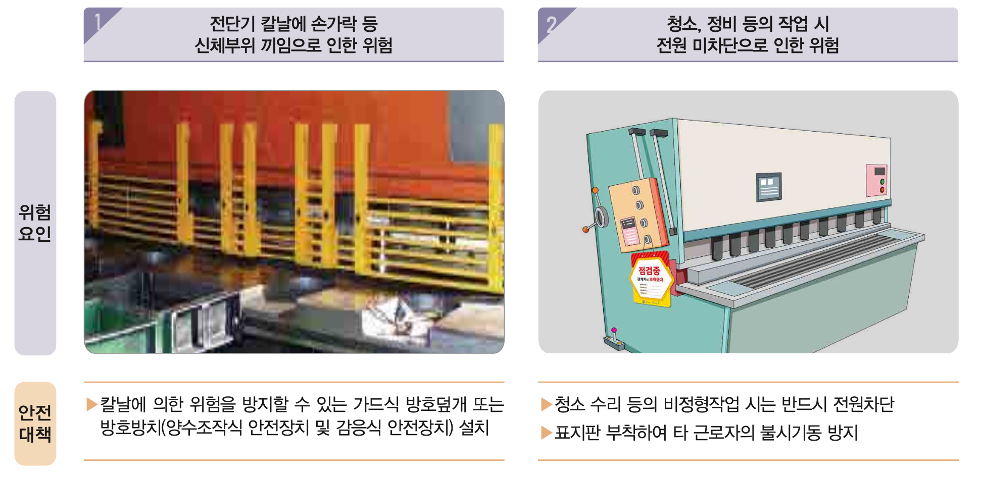 - 건축자재 생산공장에서 재해자가 전단기에 제품이 걸려 이를 확인하기 위해 점검하던 중 작동 중인 전단기에 끼임