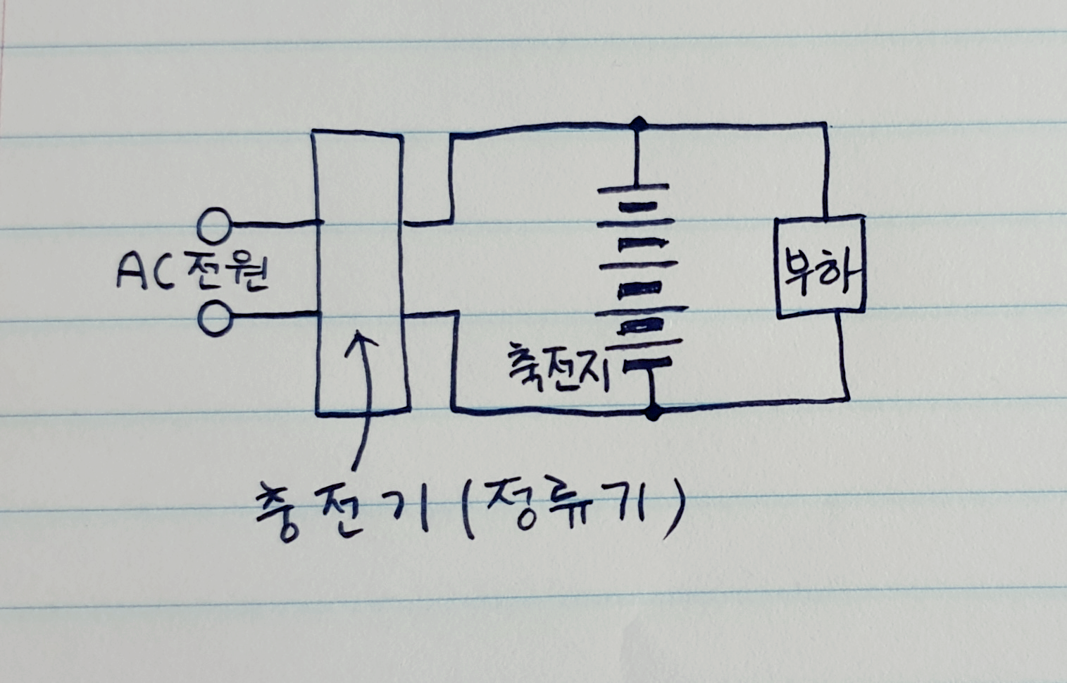 축전지의 자기방전을 보충함과 동시에 사용부하에 대한 전력공급은 충전기가 부담하고 충전기가 부담하기 어려운 일시적인 대전류 부하는 축전지로 하여금 부담하게 하는 방식의 충전방식을 말한다.