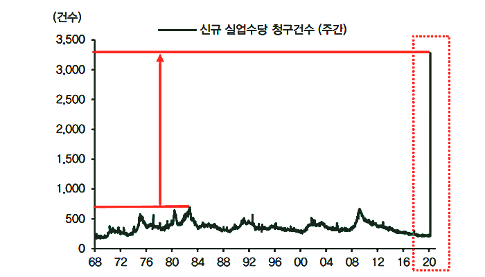 미국 내 3월 셋째 주 실업수당 청구 건수가 전주 대비 28배인 약 328만 건으로 확인되었다. 서비스업 PMI와 제조업 PMI수치 비교를 통해, <서비스업 PMI 수치가 현저히 낮아진 것을 통해>, 이번 사태가 서비스업에 선영향을 미친 것으로 보인다. <관광, 대면 서비스, 오프라인 매점 등>. 현재 상태에서 COVID-19의 확산이 제조업 중단에 영향을 미친다면, 현재 구제 금융 (비록 무제한으로 돈을 풀거라지만)계획만으로는 한계가 있을 것이다.