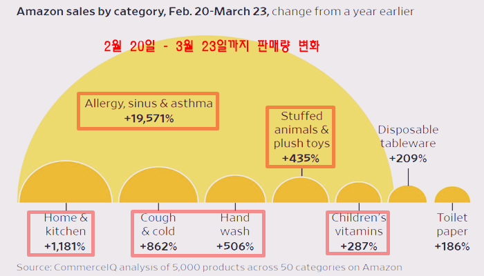 아마존이 같은 기간 약 40% 정도의 물량 증가를 보여주고 있습니다. 이는 휴가철 주문량과 비슷한 수준이라고 합니다. 건강 관련 제품 및 가정 필수 소비재 등은 예상 성장률을 훨씬 상회하고 있습니다. 이에 따라, 배송 지연 등의 문제가 발생했습니다.