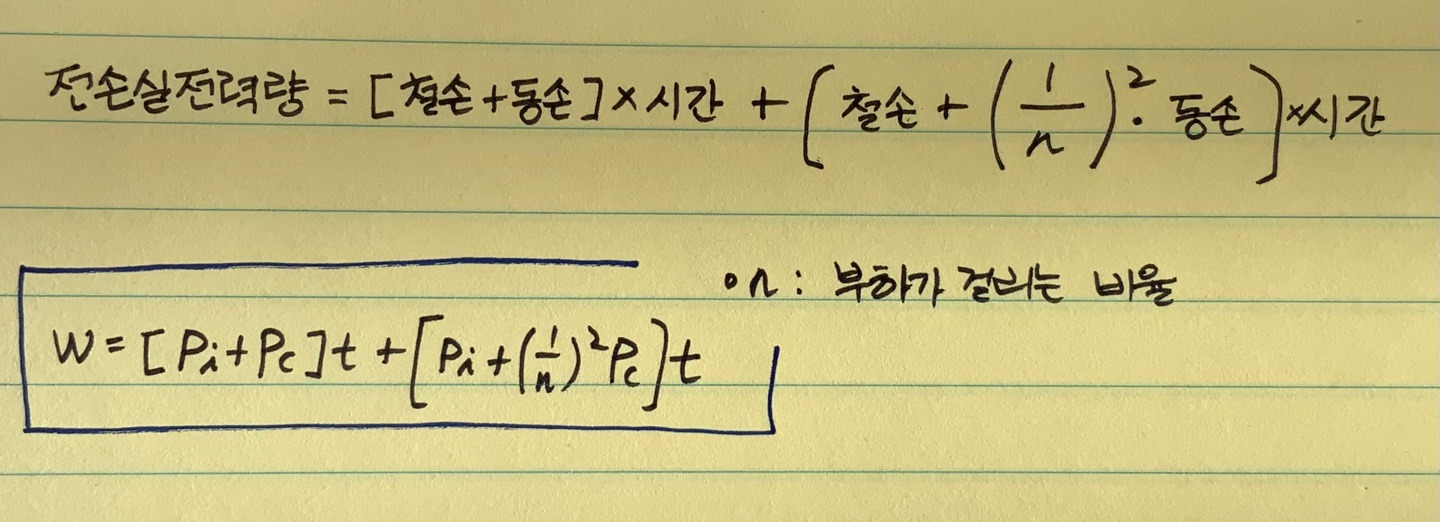전력손실전력량은 (철손+동손)에 시간을 곱한 값과 (철손+부하가 걸리는 비율의 역슈에 제곱에 동손을 곱한 값)에 시간을 곱한 값의 합니다.