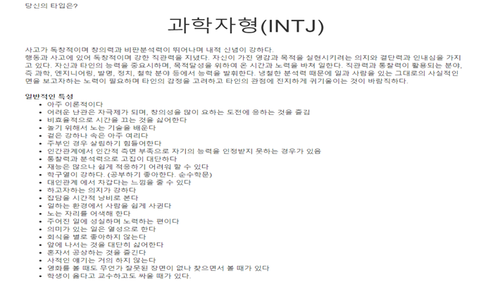 MBTI, Myers-Briggs Type Indicator, 성격 유형 검사 결과 'INTJ'.