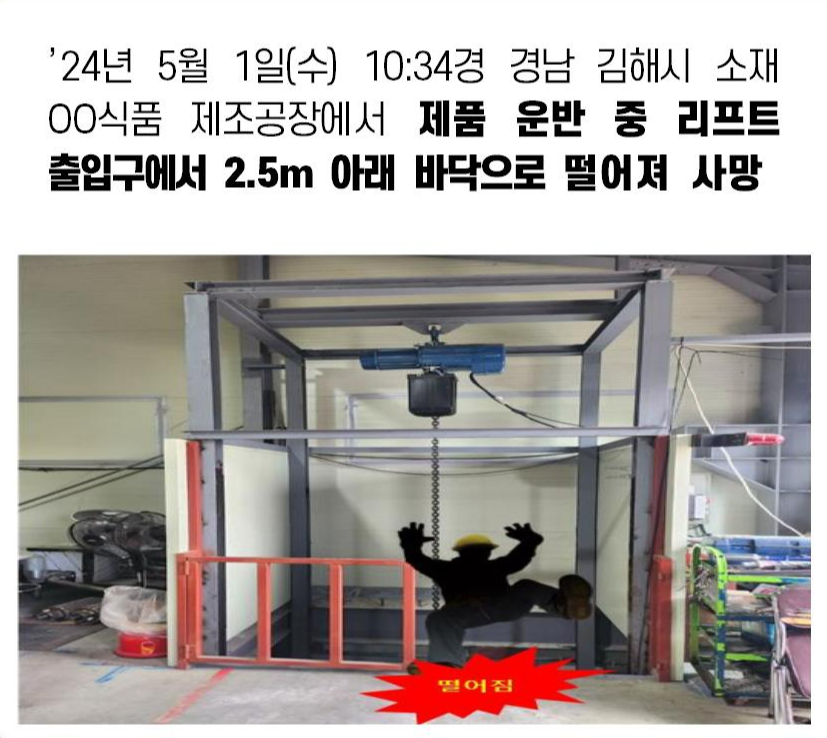 24년 5월 1일 10:34경 경남 김해시의 식품 제조업체 공장에서 리프트 위에서 작업 중이던 작업자가 제품 운반 중 리프트 출입구에서 2.5m 아래 바닥으로 추락했다. 이 사고로 머리 등을 크게 다쳐 사망했다.