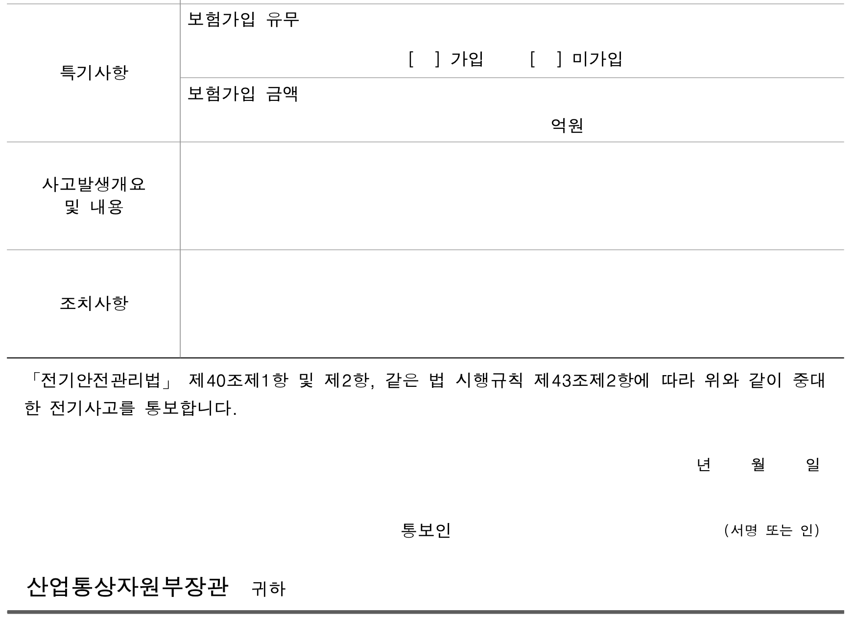 | 가. 사고 발생 후 24시간 이내: 전기안전종합정보시스템으로 통보할 것 | 1) 통보자의 소속, 직위, 성명 및 연락처 2) 사고 발생 일시 3) 사고 발생 장소 4) 사고 내용 5) 전기설비 현황(사용 전압 및 용량) 6) 피해 현황(인명 및 재산) |
