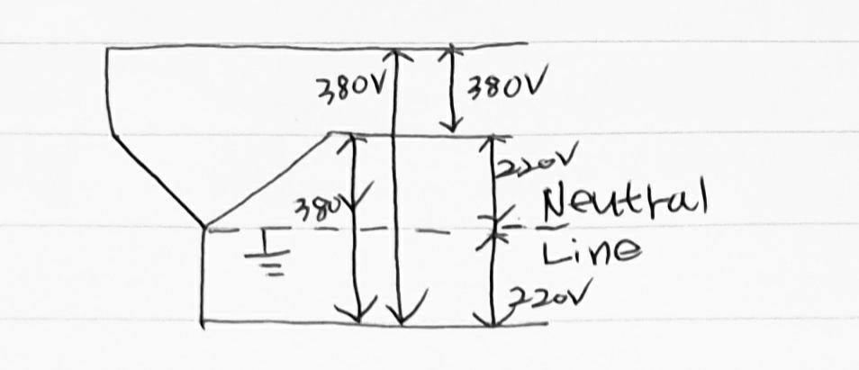 선간전압은 380[V], 상전압은 220[V]로 변압기의 Y결선에 N선(중성선)을 접지한 방식이다.