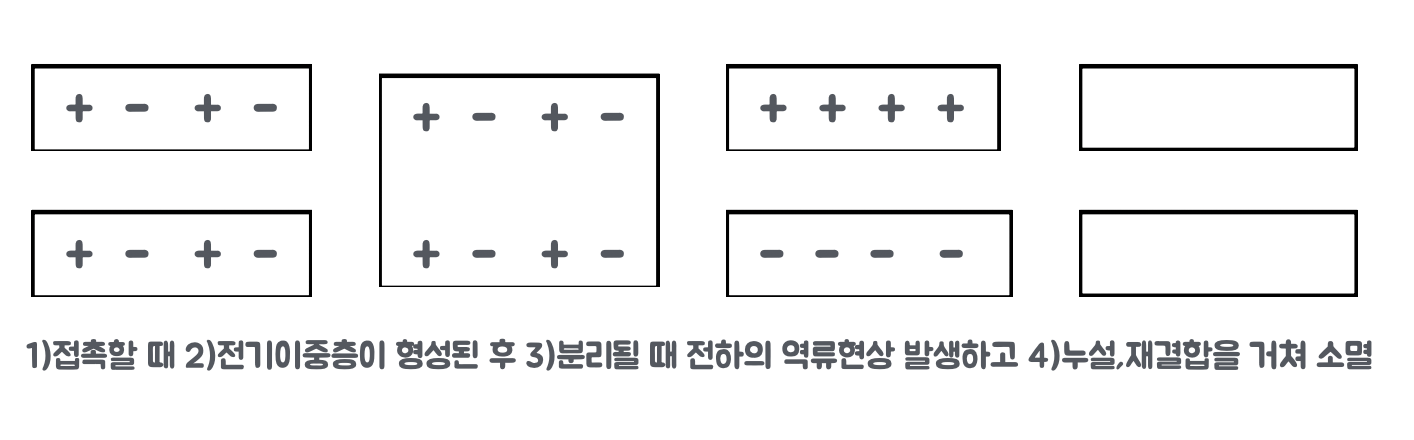 일반적으로 두 물체가 마찰하면 표면에 정전기가 발생된다. 서로 다른 두 물질이 접촉된 후 서로 분리되면서 물질내부에 자유롭게 이동하는 자유전자가 외부 물리적 힘에 의해 표면에서 표면으로 이동하여 한 물체는 (+), 다른 물체는 (-)로 대전되어 전기적인 2중층이 형성된다. 이때 전자가 들어간 쪽은 음전하(-), 전자가 나간 쪽 물체는 양전하(+)를 띤다.