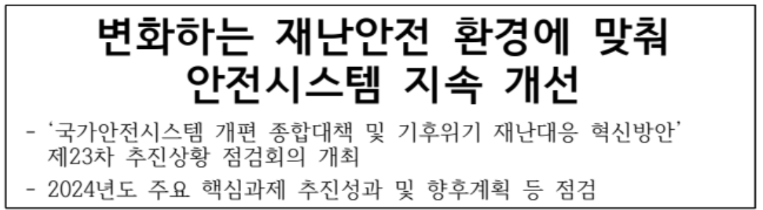 "본 저작물은 행정안전부에서 24년 작성하여 공공누리 제1유형으로 개방한 '변화하는 재난안전 환경에 맞춰 안전시스템 지속개선(작성자:재난안전전략지원단)'를 인용하였으며, 해당 저작물은 행정안전부 홈페이지에서 무료로 다운받으실 수 있습니다."