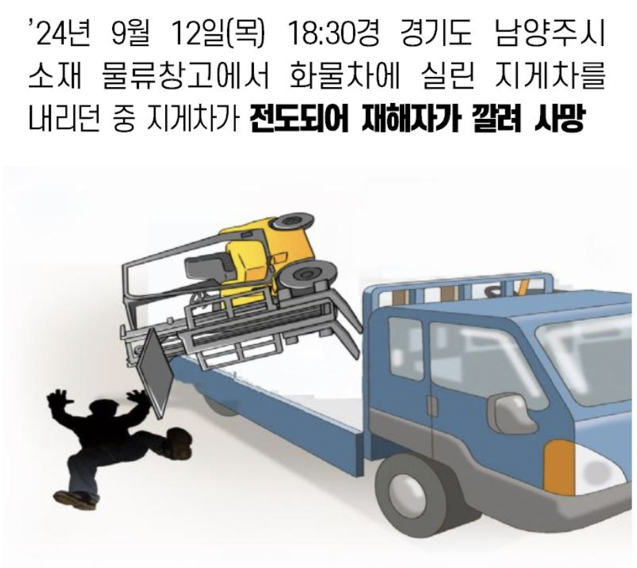 - 2024년 8월 2일 12시경, 인천 남동구 소재 재활용 처리장에서 재해자가 운반차량 점검을 위해 적재함 위로 올라가다가 바닥으로 떨어짐.