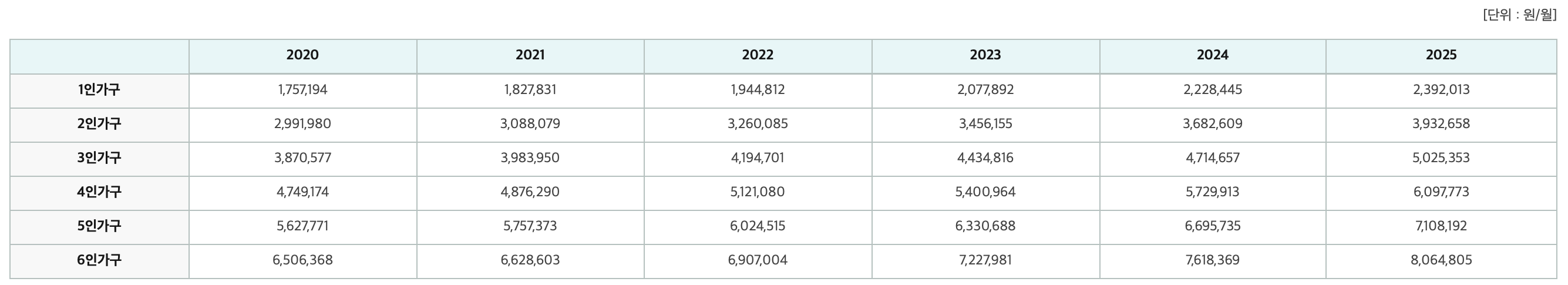 우리나라 2023년 3인가구 기준 중위소득은 4,714,657만 원, 미국의 경우 2015년 4인가족 기준 연 소득 24,250달러로 나타난다.
