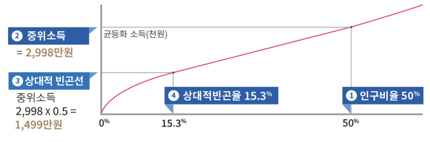중위소득 2,998만 원인 경우, 상대적 빈곤선은 1,499만 원이며, 상대적 빈곤율은 15.3%가 됩니다.