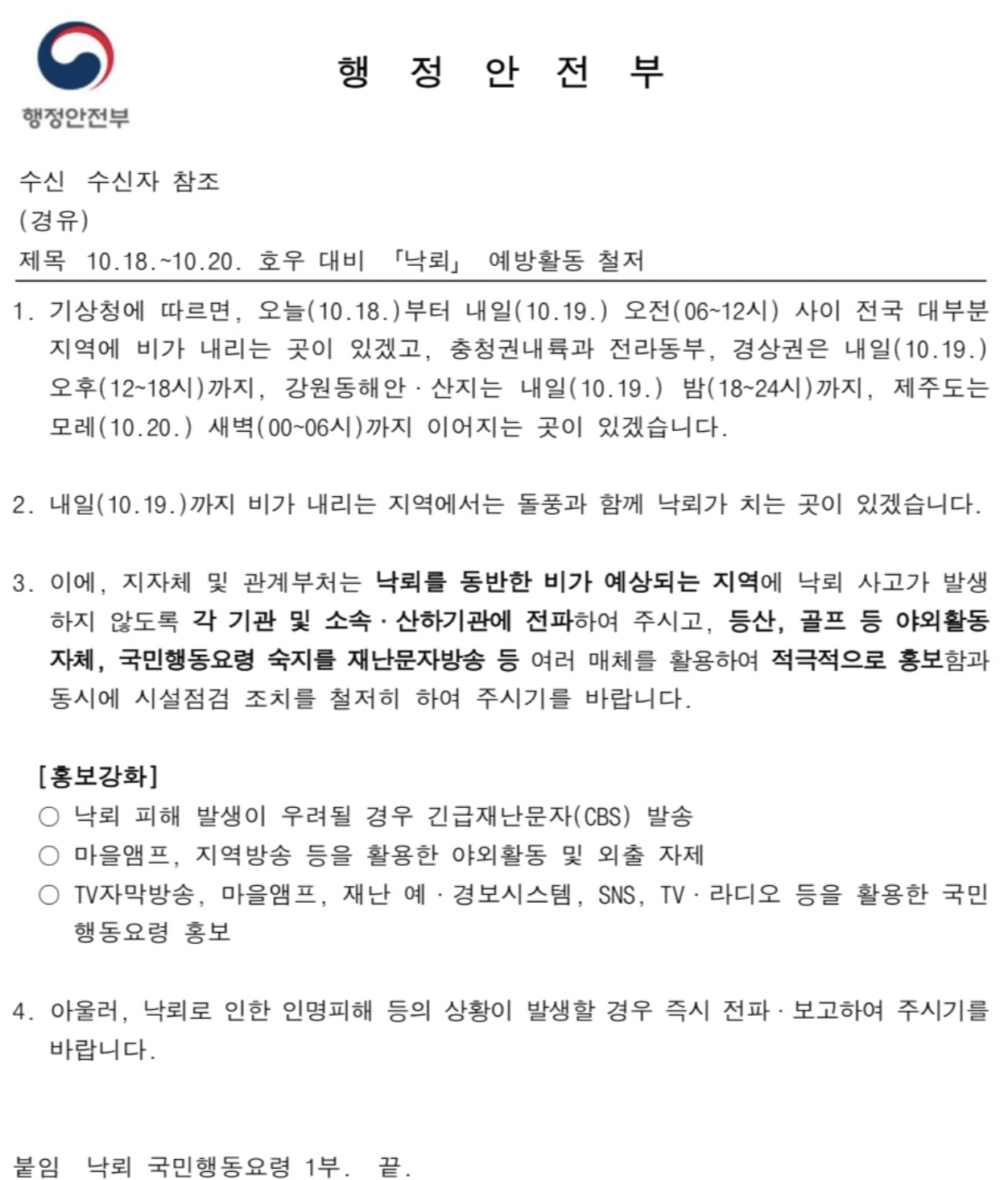 행정안전부는 10월 18일 ~ 10월 20일, 호우 대비 "낙뢰" 예방활동을 철저히 할 것을 당부했다. 낙뢰를 동반한 비가 예상되는 지역은 상황을 전파하고 등산, 골프 등 야외활동 자제 등 적극적으로 홍보 및 시설점검 조치해야 한다. 구체적으로 아래와 같은 국민행동요령을 실천해 인명피해를 사전에 예방하도록 노력해야 한다.