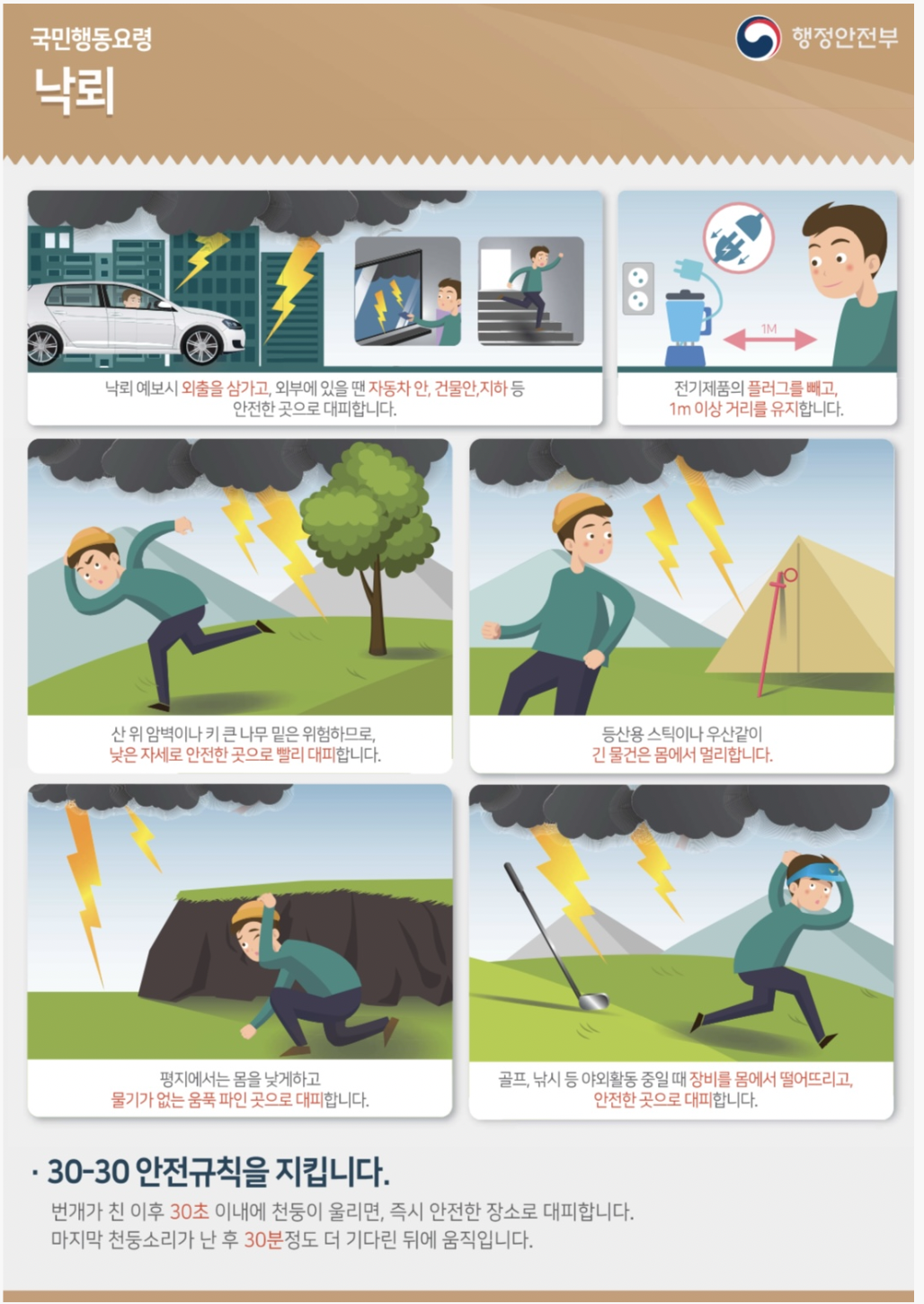 30-30 안전규칙은, 번개가 친 이후 30초 이내에 천둥이 울리면, 즉시 안전한 장소로 대피한다. 마지막으로 천둥소리가 난 후 30분정도 더 기다린 뒤에 움직인다.