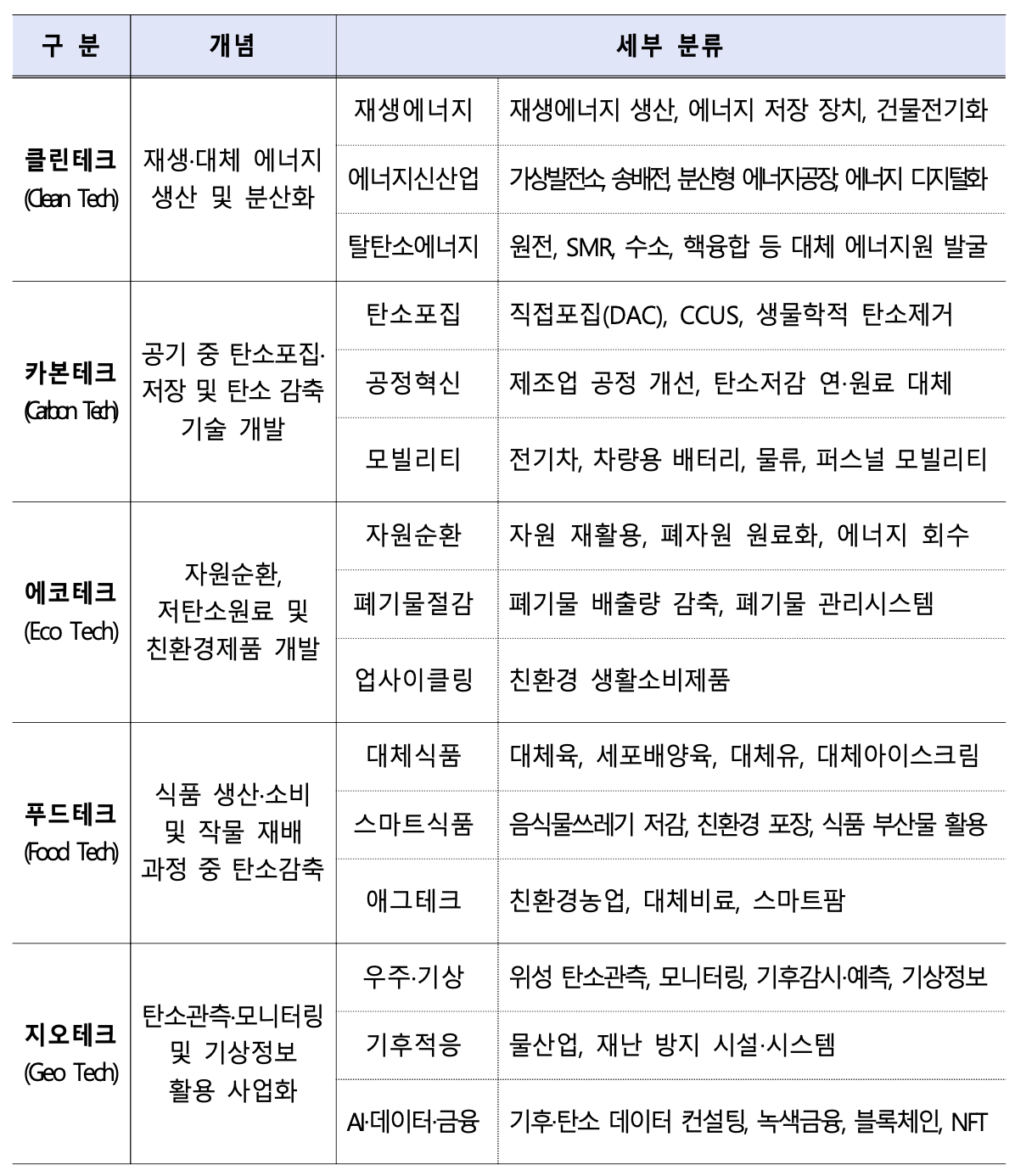 기후테크는 Climate(기후)와 Technology(기술)의 합성어다. 온실가스 감소와 기후적응에 기여하는 클린, 카본, 에코, 푸드, 지오테크의 5개 분야로 구분된다.