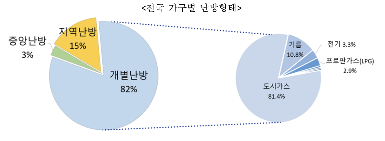 통계청 인구총조사에 따르면, 우리나라 10가구 중 8가구가 도시가스나 기름, 전기 등을 활용한 개별난방 보일러를 사용하는 것으로 나타났다.