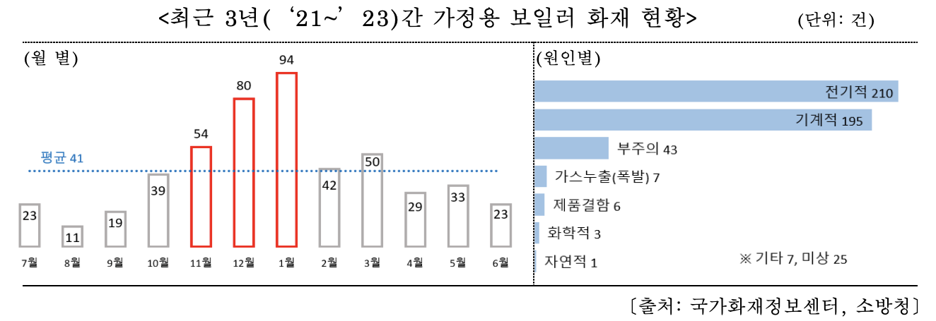 원인별로는 전기접촉 불량 등 전기적 요인(210건, 42%)과 보일러 과열·노후 등 기계적 요인(195건, 39%)이 대부분을 차지했다.