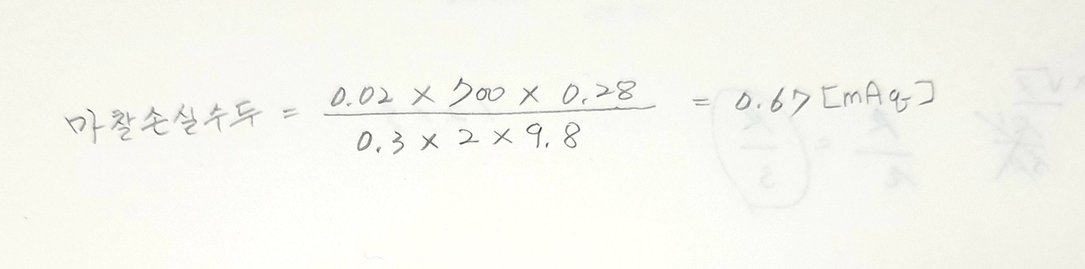 위 공식에 값을 대입하여 마찰손실수두를 구하면 다음과 같이 0.67[mAg]만큼 에너지가 소모되었음을 알 수 있다.