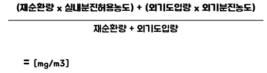 농도 = ( 재순환량 x 실내분진허용농도 + 외기도입량 x 외기분진농도 ) / 재순환량 + 외기도입량