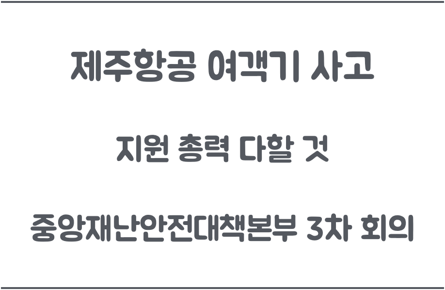정부는 최상목 대통령 권한대행 주재로 12월 29일(일) 20시 제주항공 여객기 사고 수습 지원 및 대처 중앙재난안전대책본부 3차 회의(국무조정실, 행정안전부, 국토교통부, 보건복지부, 경찰청, 소방청, 전라남도, 한국공항공사 등)를 개최했다.