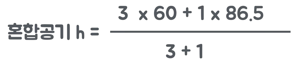 혼합공기 엔탈피는 외기 엔탈피 86.5[kJ/kg] 와 실내공기 엔탈피 60[kJ/kg] 를 환기량과 외기량의 비로 계산하면 약 66.6[kJ/kg] 이다.