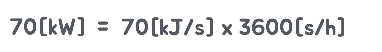 1) 분자는 가열코일 부하로, 가열코일 부하 70[kW]는 1초에 70[kJ]의 에너지를 사용하는 것을 의미하며, 1시간은 3600초(1[h] = 3600[s])이므로 아래와 같이 변환할 수 있다.