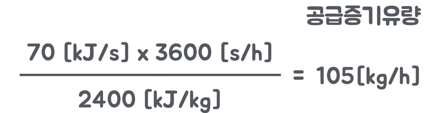 2) 분모는 증기가 기체에서 액체로 변화(응축)할 때 방출되는 열량, 응축잠열[kJ/kg]이다. 1[kg]의 증기가 응축될 때 발생하는 열을 코일, 교환기 등에 전달하는 역할이다. 응축잠열이 2400[kJ/kg] 인 경우 코일의 공급증기유량은 105[kg/h] 이다.