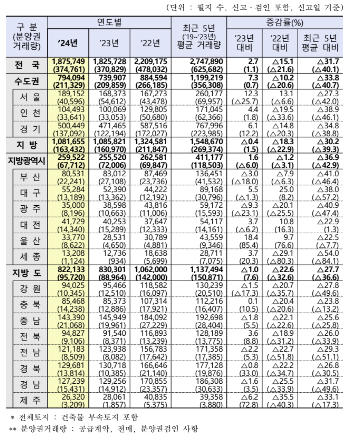 ■ 24년 전체토지(건축물 부속토지 포함) 거래량은 약 187.6만 필지(1,236.3㎢)이다. 23년 대비 2.7% 증가, 22년 대비 15.1% 감소로 나타났다. 24년 전체토지 거래량은 23년 대비 울산 18.4%, 서울 12.3% 등 9개 시·도 증가, 8개 시·도는 감소하였다. 순수토지 거래량은 서울 22.1%, 대전 11.0% 등 4개 시·도 증가, 13개 시·도는 감소하였다.