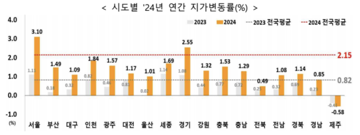 ■ 24년 전국 지가는 2.15% 상승하였다. 지가변동률은 용인처인구 5.87%, 서울 강남구 5.23%, 성남수정구 4.92% 등 252개 시군구 중 54개 시군구가 전국 평균을 상회하였다.