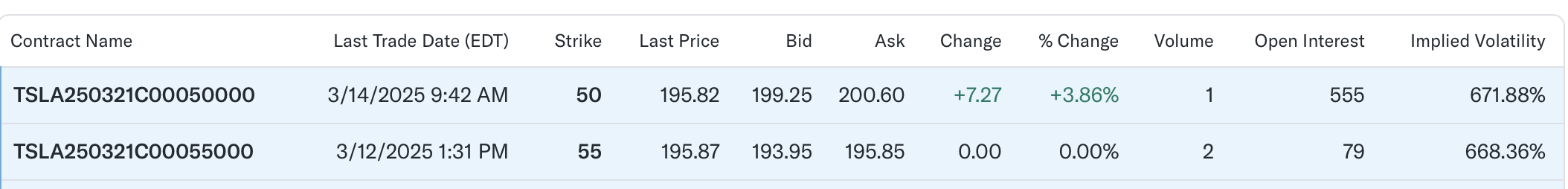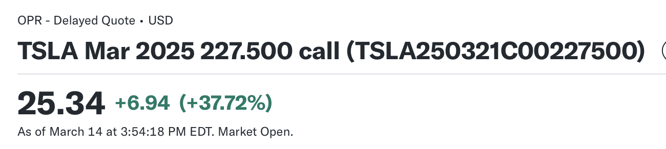 콜옵션은 정해진 가격에 주식을 사거나 팔수 있는 권리다. 예를 들어, TSLA250321C00227500 네임에서 TSLA는 테슬라 기업의, 25년03년21일 에 만기되는 C 콜옵션, 227.50에 살 수 있다는 의미다. 즉, 오늘 주가가 얼마인 테슬라 주식을 미래 날짜인 25년 3월 21일에 만기되기 전에 콜옵션으로 227.5달러에 살 수 있다. 옵션은 Contract 계약단위로 이뤄지며, 1계약은 100주의 Strike Price로 계산한다.