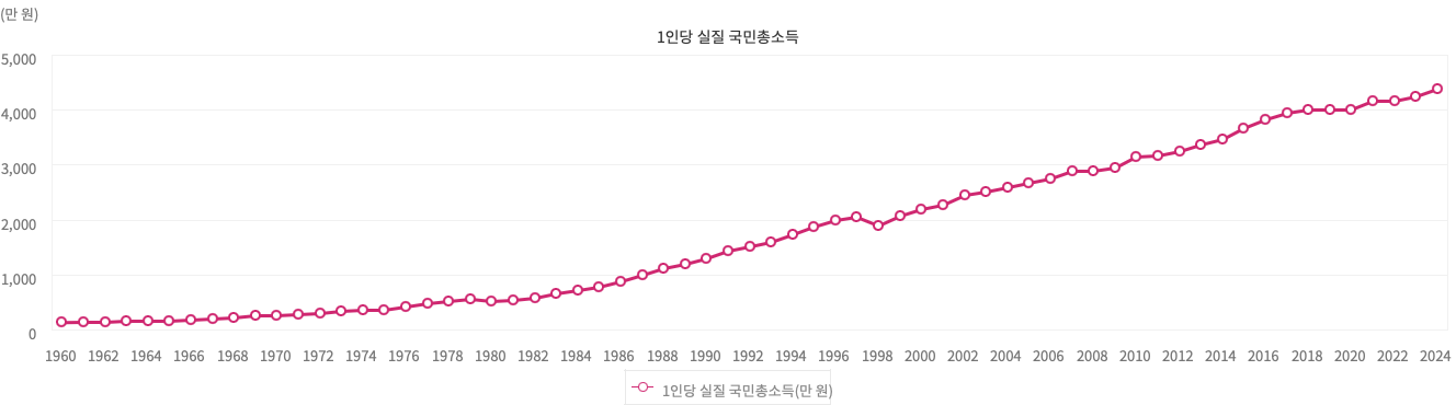 우리나라는 경제발전으로 1인당 실질 국민총소득이 증가했다. 1980년 1인당 실질 국민총소득은 528만 원에서 2024년 4,381만 원으로 약 8배 증가했다(2023년부터 잠정치임). 과거에는 고소득 직업이 절약과 투자로 시간을 투자해 백만장자에 도달했다면, 현재는 직장인도 같은 방법으로 백만장자에 도달할 수 있다.(100만 달러는 14억 5,380만 원, 환율 1458.30원 기준)
