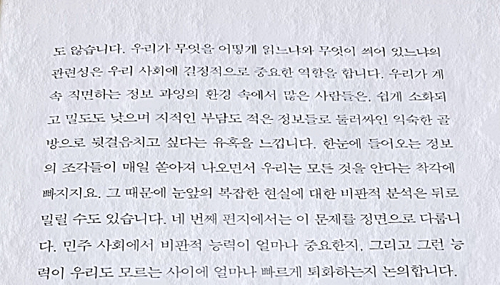 '우리가 계속 직면하는 정보 과잉의 환경 속에서 많은 사람들은, 쉽게 소화되고 밀도도 낮으며 지적인 부담도 적은 정보들로 둘러싸인 익숙한 골방으로 뒷걸음치고 싶다는 유혹을 느낍니다. 한눈에 들어오는 정보의 조각들이 매일 쏟아져 나오면서 우리는 모든 것을 안다는 착각에 빠지지요.' - 다시 책으로, 매리언 울프