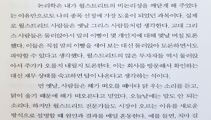월스트리트 사람들은 옛날 그리스 사람들처럼 생각한다. 이들은 말의 이빨을 세어 보는 대신 둘러앉아 토론하면서도 파악할 수 있다고 생각했다. 월스트리트의 많은 투자자들 역시 둘러앉아서 주가가 오를지 내릴지 토론한다. 이는 회사를 방문해서 확인하는 대신 재무 상태를 숙고하면 답이 나온다고 생각하는 식이다.