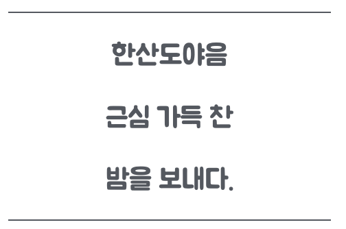 우리도 근심으로 가득 찬 잠 못 드는 밤을 지낸다. 이상과 현실 속 간극으로 하루하루를 헛되게 소비한다. 한산도 대첩을 승리로 이끈 명장도 우리와 같은 고민을 했었다. 하지만 적진으로 달려가 휘두를 칼을 비췄다. 싸우지 못하고, 무의미한 삶을 살아간다는 게 더 두려운 것이다. 이 사실 하나를 떠올리며, 근심 가득한 밤이 유의미한 삶의 토대가 되길 바란다.