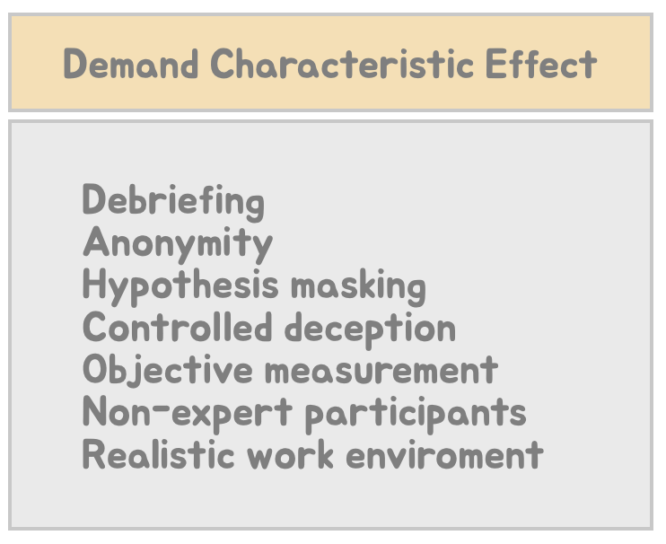 요구특성효과를 줄이기 위해서는 실험 및 사용자 테스트 설계, 작업환경 구성, 시스템 검증 방식 전반에 걸쳐 구조적인 고려가 필요하다.