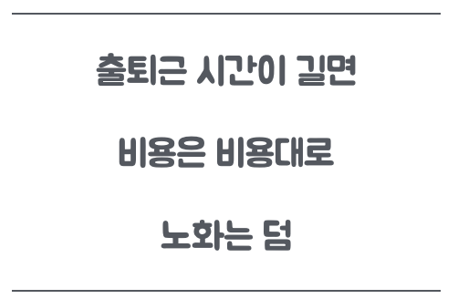 결론적으로 장거리 출퇴근은 단순히 교통비용을 넘어서 개인 삶의 질 전반에 부담을 준다. 교통비 포함 단순 비용만 651,200원이다. 줄어든 수명은 얼마이며, 가족과 만들 수 있는 추억의 비용은 어떻게 값을 매길까?