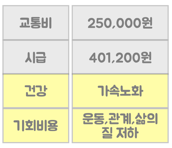 30분 거리 직장을 다닐 경우, 하루 2시간을 출퇴근에 더 사용한다고 가정해 봤다. 최저시급만 적용해도 매일 20,060원이며, 한 달 401,200원이다.
