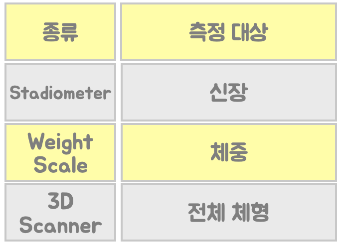 6) 3D 스캐너 (3D Body Scanner): 레이저나 광학 센서를 이용하여 인체의 수많은 정밀한 3차원 치수 데이터를 비접촉 방식으로 빠르게 측정하는 장비.