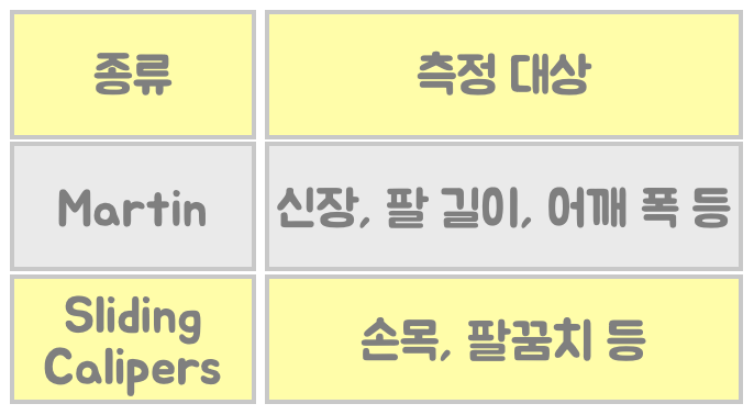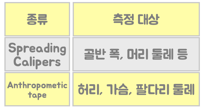 2) 캘리퍼스 (Calipers): Sliding Calipers와 Spreading Calipers를 사용한다. Sliding Calipers은 슬라이딩 구조로, 뼈의 폭 또는 짧은 거리(예: 손목 너비, 팔꿈치 폭 등)를 정밀하게 측정한다. Spreading Calipers은 곡면이나 넓은 부위 간, 예를 들어 골반 너비, 머리 둘레 등 두 지점 간 거리 측정에 적합하다.