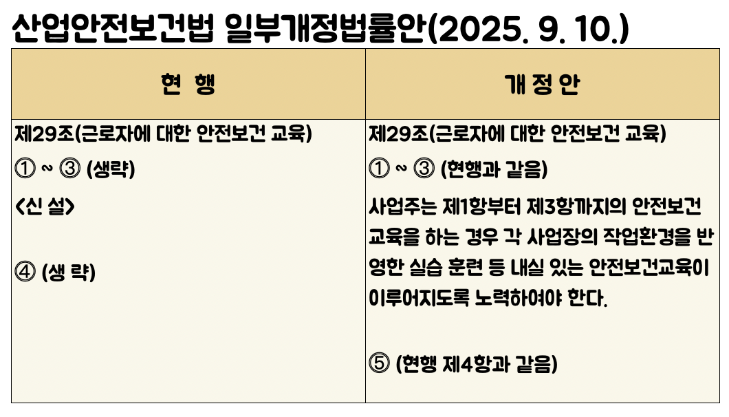 2025년 9월 10일 김위상·김선교·김정재·김기현·우재준·추경호·이종배·박충권·김성원·강승규·김재섭 의원 11인은 ‘산업안전보건법 일부개정법률안’을 발의했다. 개정안은 제29조에 제4항을 신설해, 사업주가 각 사업장의 작업환경을 반영한 실습·훈련 등 내실 있는 안전보건교육이 이루어지도록 노력할 의무를 부과하는 내용을 담고 있다.