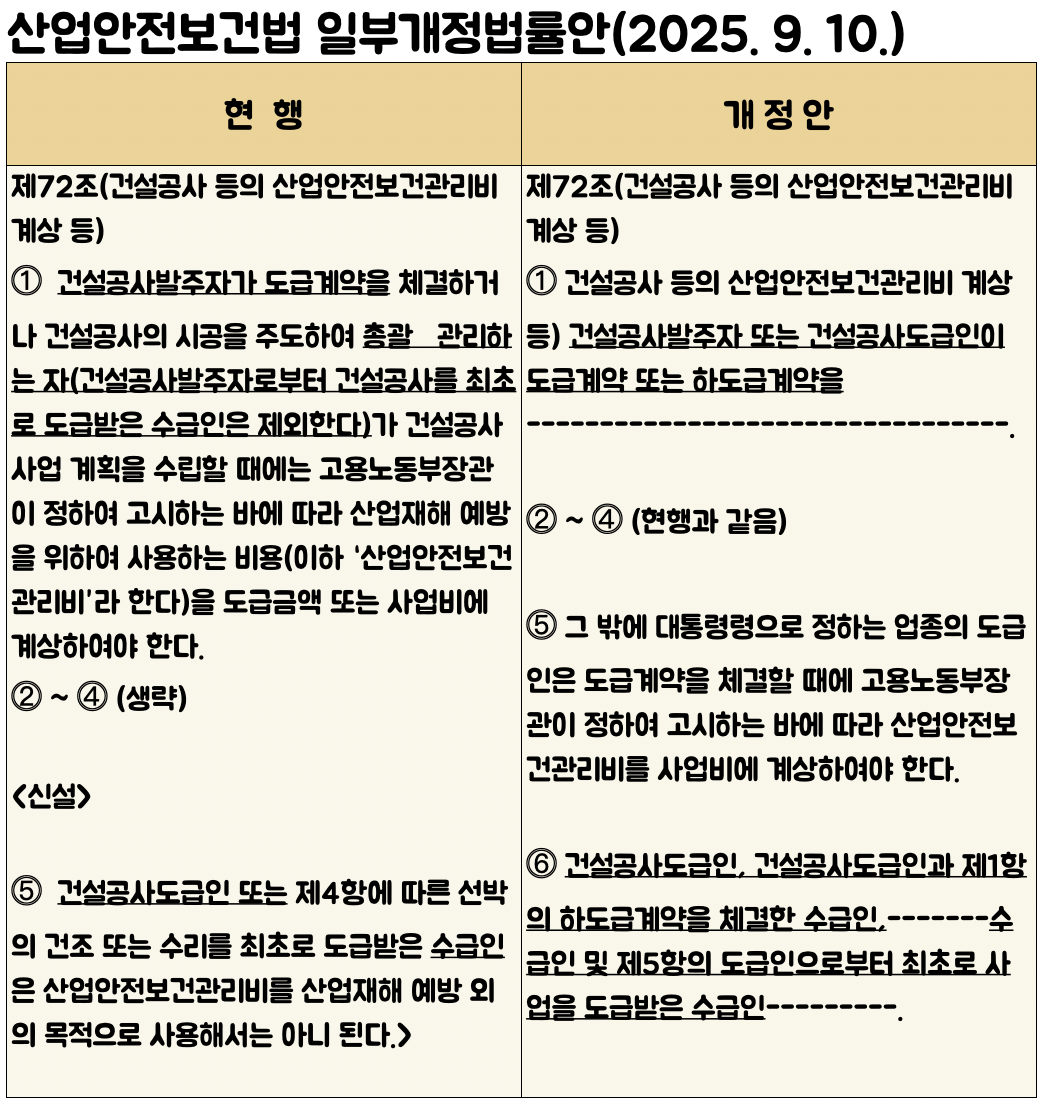 개정안은 제72조에 제5항을 신설해, 하청에서 중대재해가 집중되는 현실을 겨냥, 산업안전보건관리비를 원청(건설공사도급인)까지 계상 의무를 넓히고, 하도급 계약 체결 시점에 산안비를 계약서에 반영하도록 하며, 나아가 대통령령으로 정하는 기타 업종의 도급계약에도 원청 의 안전보건확보의무를 강화하려는 내용을 담고 있다.