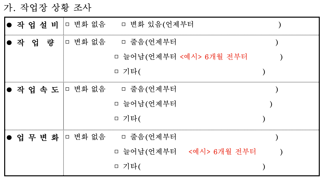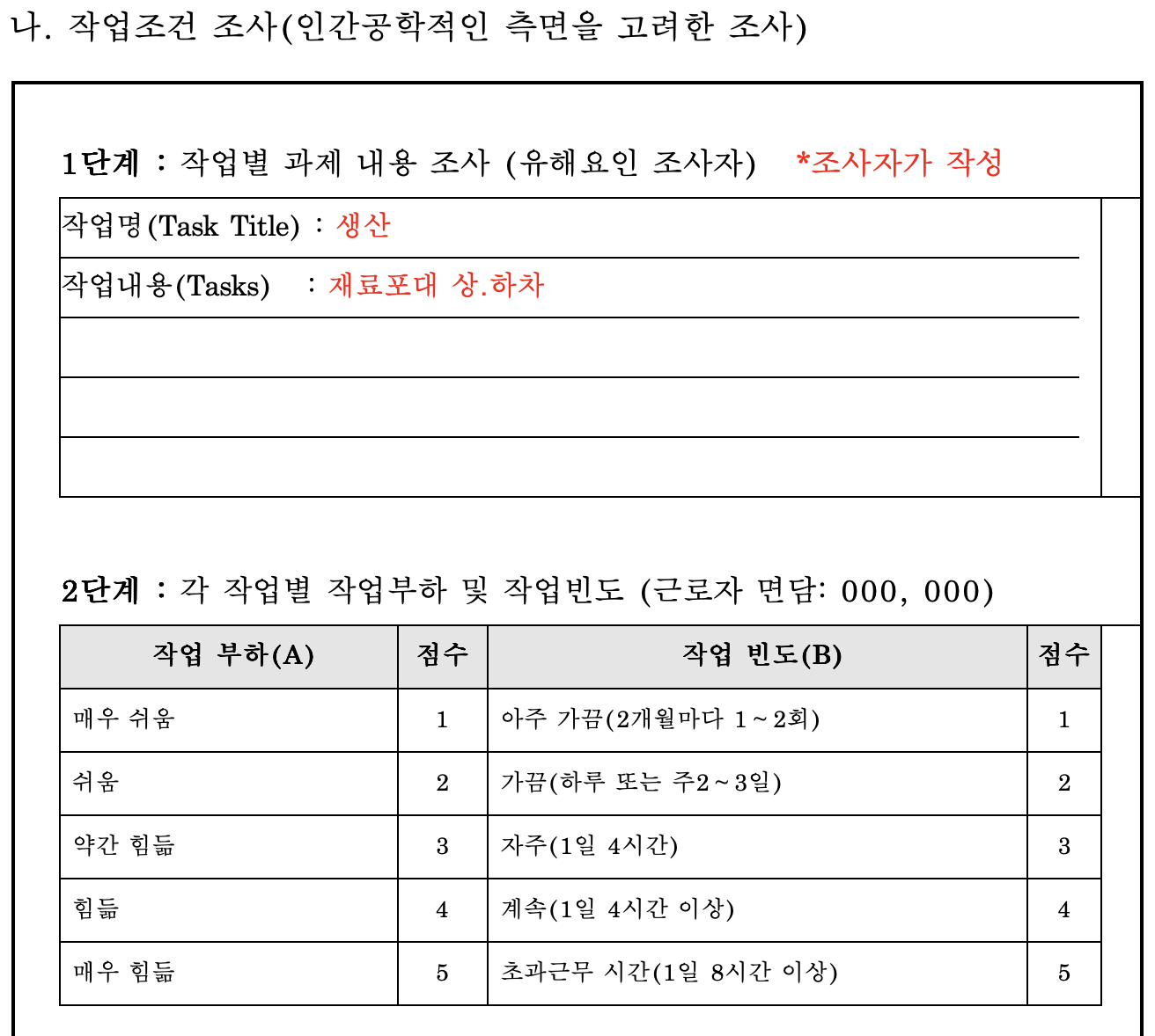 ‘작업장 상황 조사, 작업조건 조사, 증상 조사’
