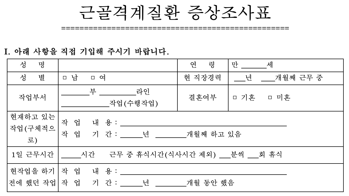 근골격계질환 증상조사 포함항목 '작업자 상태 중심'