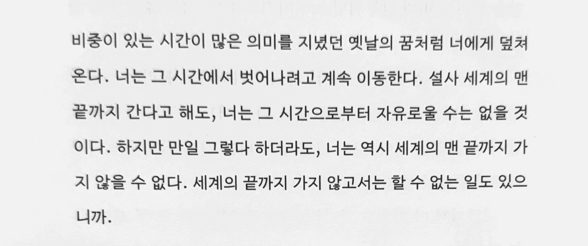 무의식의 바다는 우리가 통제할 수 없다. 그러나 그 위에서 방향을 정하는 작은 결심은 우리 몫이다. 그래서 '나쁜 일은 아무것도 일어나지 않았어;라고 말하며 시간을 버는 듯 보였다. 그리고 아주 작은 선택을 더한다. 앞으로 가겠다, 오늘은 문을 닫겠다, 다시 읽겠다. 책을 덮고도 귓가에 파도 소리가 남는 이유가 여기에 있다. 이해보다 끌림이 먼저였던 독서는, 이 문장 하나로 책임의 자리까지 이어진다.