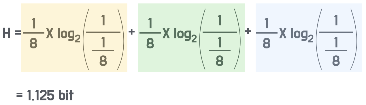 - 각 순서의 확률은 모두 (1/2)^3 = 1/8 = 0.125 bit