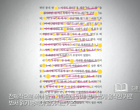 책 읽는 과정을 보여줍니다. 글자를 순서대로 읽지 못하고 건너뛰면서 읽는 출연자가 나옵니다. 글을 그냥 건너뛰고 읽다가 다시 돌어와서 읽기도 합니다. 책 읽기가 아니라 모니터를 보듯이 말이죠. 읽으면서 따라오는 지식과 함께 뇌가 변하는 '뇌 가소성'이 없습니다. 이게 우리가 독서에서 얻는 기하학적 연결일텐데요.